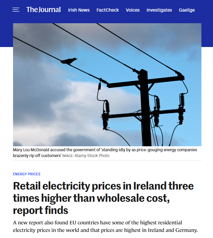 📄 Read the full article on The Journal.ie: Retail electricity prices in Ireland three times higher than wholesale cost